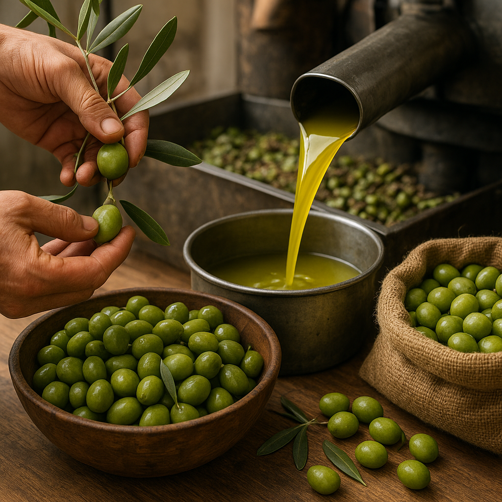 Tradycyjnie oliwki zgniatano kamiennymi żarnami, jednak dzisiejsze zakłady wykorzystują prasy wałkowe lub ekstrakcję ciągłą z zastosowaniem wirówek. Podstawowe etapy procesu obejmują: